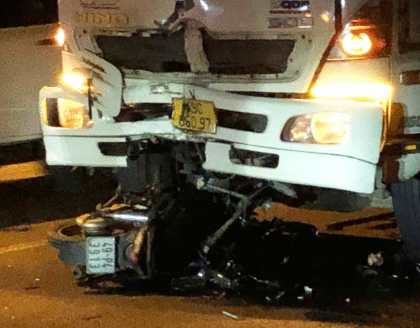 Vụ va chạm khiến xe máy bị cuốn vào gầm xe tải kéo lê nhiều mét trên đường, ông Nguyên tử vong tại chỗ.