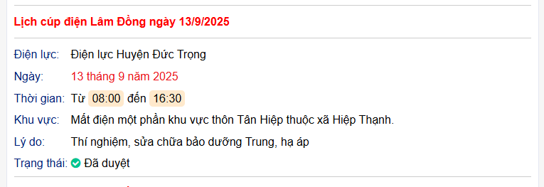Lịch cúp điện dự kiến Lâm Đồng ngày 13/9/2025 bởi Name NoTháng 9 12, 2025Leave a CommentLịch cúp điện dự kiến Lâm Đồng ngày 13/9/2025TRANG CHỦ Lịch cúp điện dự kiến Lâm Đồng ngày 13/9/2025