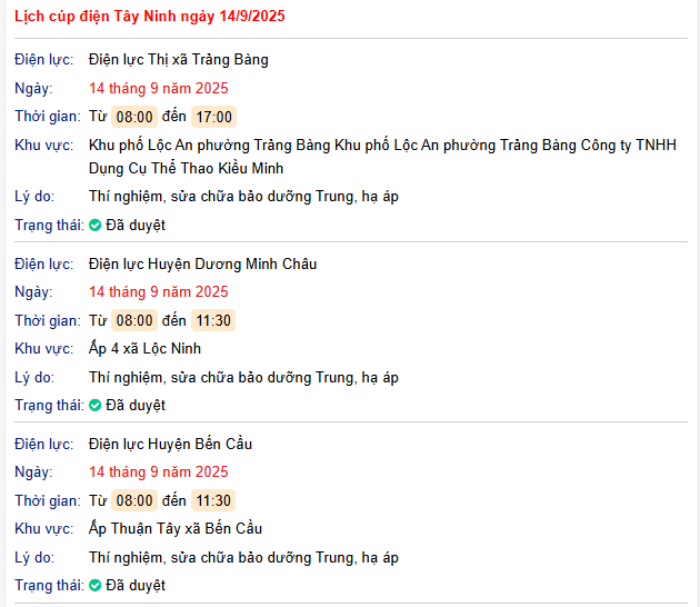 Lịch cúp điện dự kiến Tây Ninh ngày 14/9/2025 bởi Name NoTháng 9 13, 2025Leave a CommentLịch cúp điện dự kiến Tây Ninh ngày 14/9/2025TRANG CHỦ