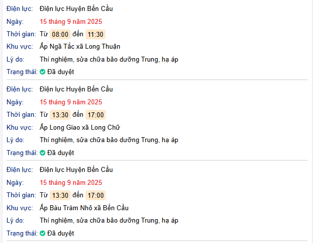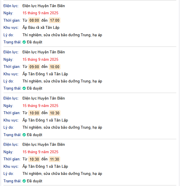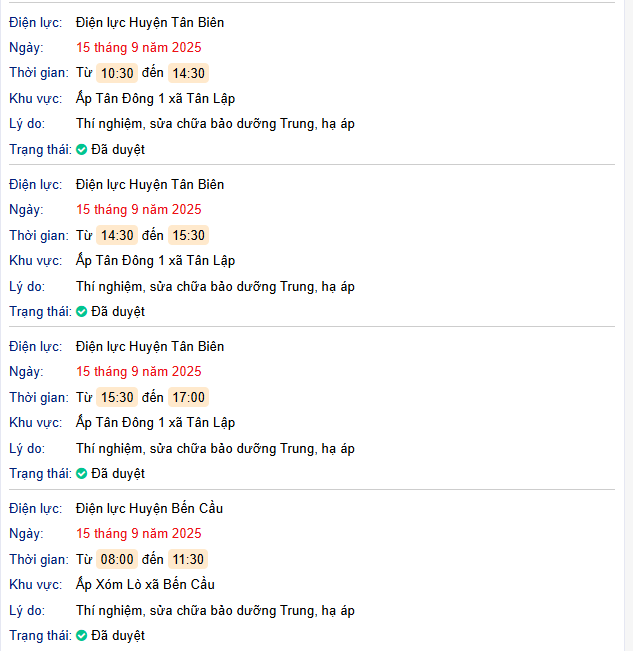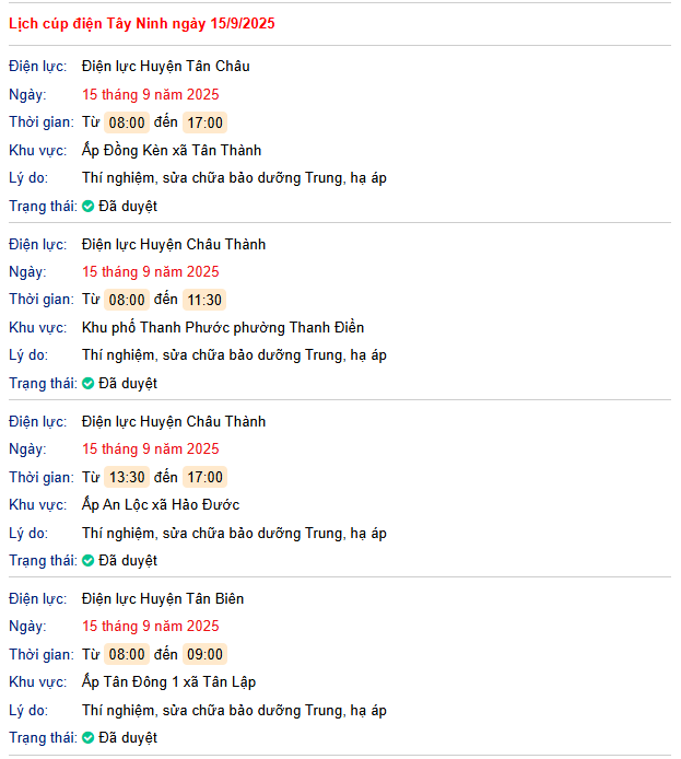 Lịch cúp điện dự kiến tỉnh Tây Ninh (cũ) ngày mai 15/9/2025 bởi Name NoTháng 9 14, 2025Leave a CommentLịch cúp điện dự kiến tỉnh Tây Ninh (cũ) ngày mai 15/9/2025TRANG CHỦ Lịch cúp điện dự kiến tỉnh Tây Ninh (cũ) ngày mai 15/9/2025