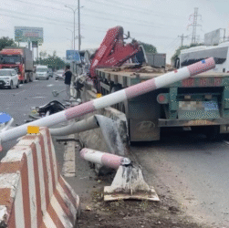 Ô tô đầu kéo chở cần cẩu, kéo theo rơ-móc bất ngờ đâm mạnh vào dải phân cách cứng trên …