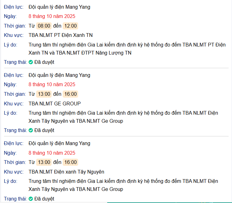 Thông báo lịch cúp điện Gia Lai ngày mai 08/10/2025 (Lịch riêng khu vực Gia Lai cũ) bởi Name NoTháng 10 7, 2025Leave a CommentThông báo lịch cúp điện Gia Lai ngày mai 08/10/2025 (Lịch riêng khu vực Gia Lai cũ)TRANG CHỦ Lịch cúp điện Gia Lai ngày 8/10/2025