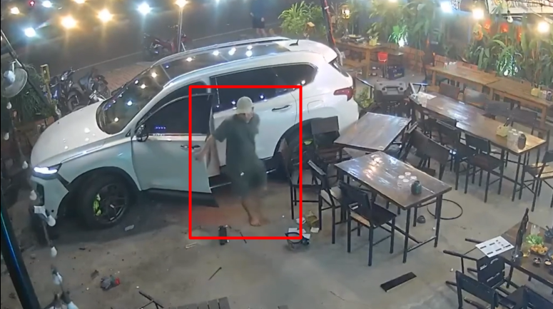Lúc này trong quán nhậu vắng khách, ôtô tông trực diện một người phụ nữ ngồi trong quán (mẹ của chủ quán) khiến người này bị húc văng ra xa. Sau khi thực hiện cú tông, xe ô tô lùi lại chừng 4 m, một người đàn ông đội nón, mặc quần cộc, áo thun bước xuống, tiến về phía nạn nhân bị tông trúng.